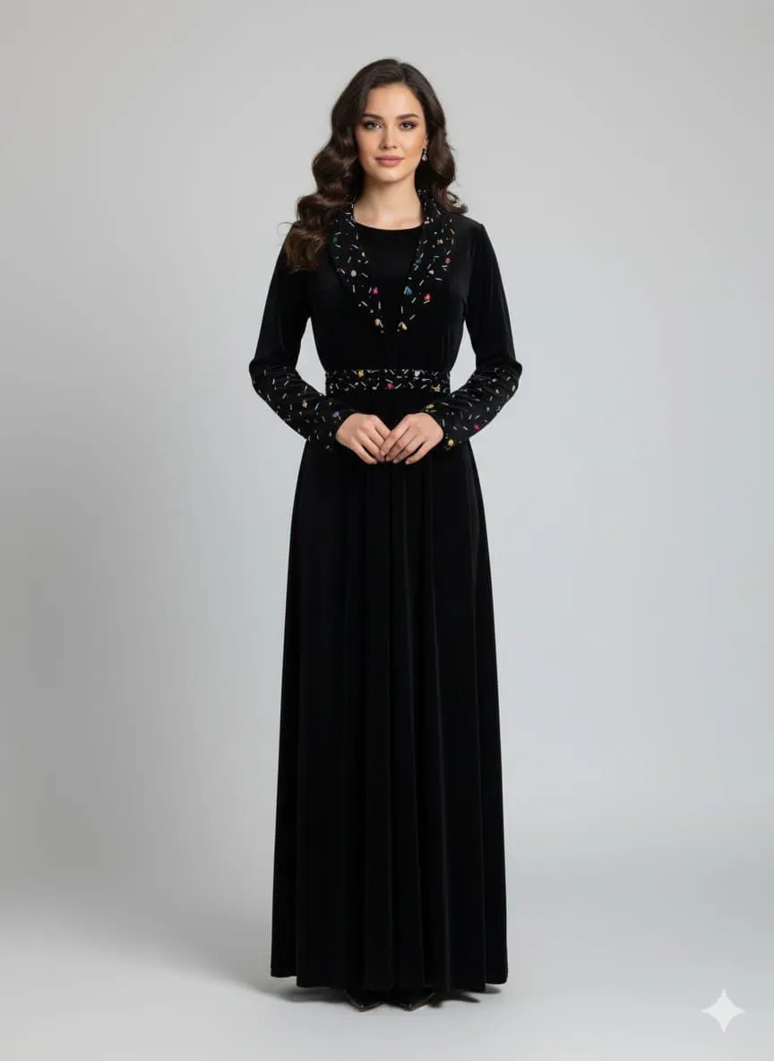 فستان سهرة مخمل قطيفة مع تطريز يدوي بالكرستال