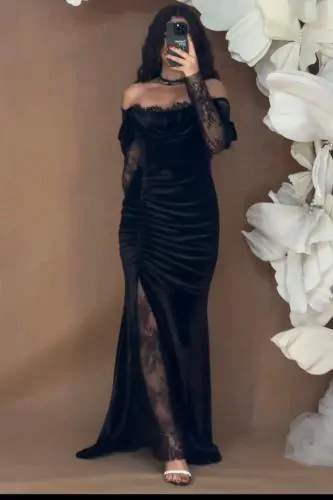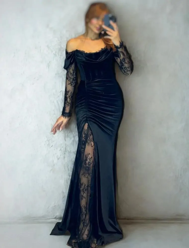 فستان سهرة خامة قطيفة كوري مع دانتيل أسود أنيق